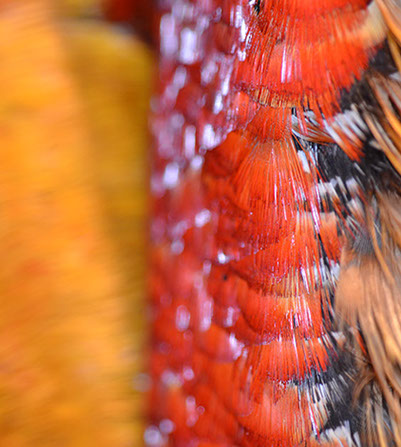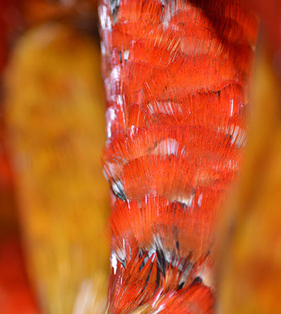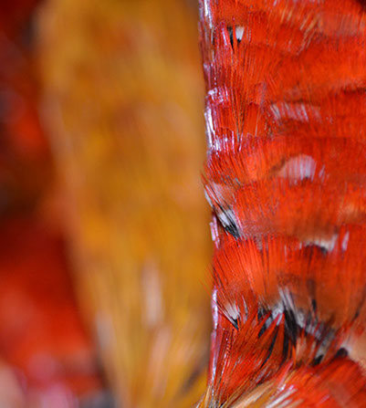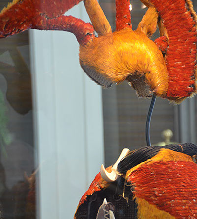 披肩长60英寸(150厘米),用了近25万根红腹锦鸡的羽毛。腰带长近12尺(约366厘米),6英寸宽(15厘米),两侧除了使用红腹锦鸡羽毛外,还使用了白腹锦鸡橘红色的羽毛。而这件手工编织的头戴几乎全是用红腹锦鸡羽毛制成。
