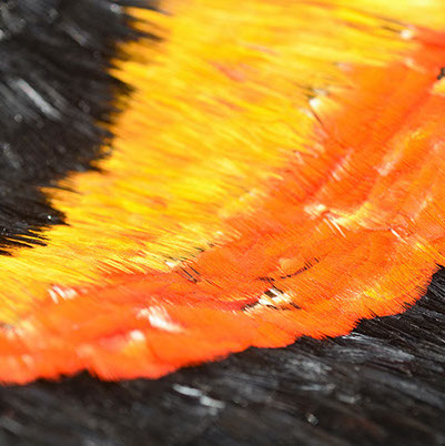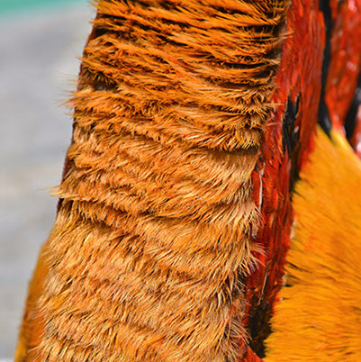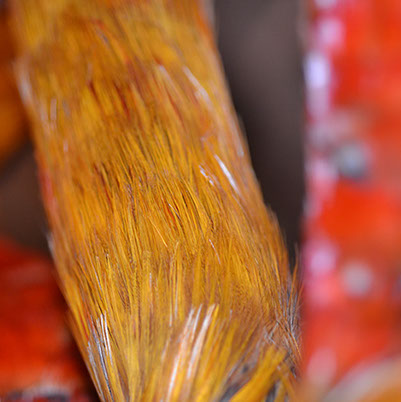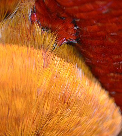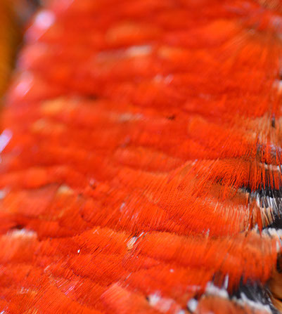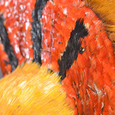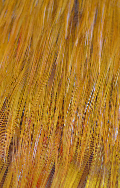 60 인치 길이의 망토는 중국 금계에서 얻은 각각의 황금색 가슴 깃털을 거의 25만개나 사용합니다. 거의 12피트 길이와 6 인치 넓이의 어깨띠는 황금 금계의 깃털 외에도 레이디 애머스트 꿩의 붉은 오렌지색 깃털을 모두 이용한 것이 특징입니다. 손으로 짠 헬맷은 전부 황금 꿩의 깃털로 만들었습니다.