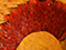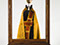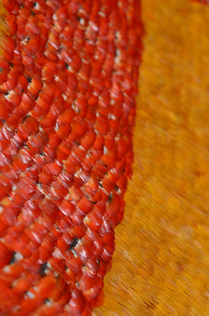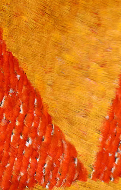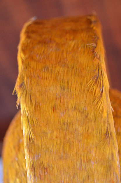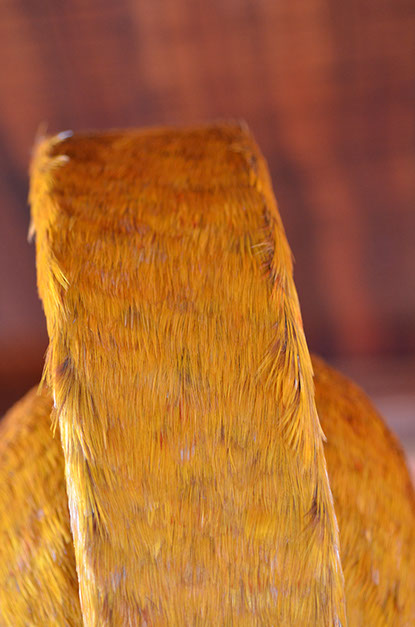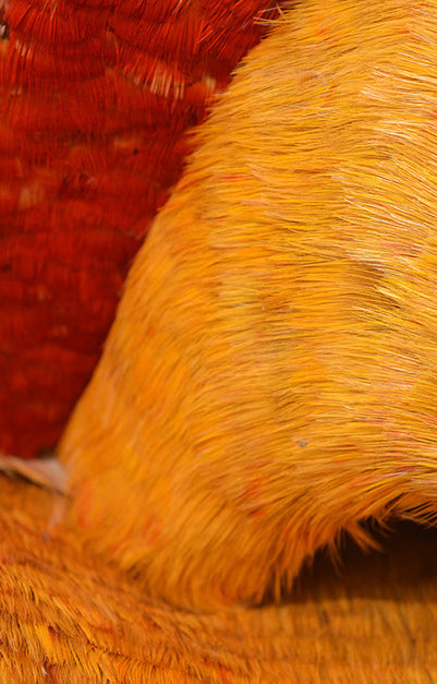 The cape, which measure 60 inches in length, uses nearly a quarter million individual golden breast feathers from Chinese golden pheasants. The sash, which is nearly 12 feet long and six inches wide, is feathered on both sides featuring the reddish-orange feathers of the Lady Amherst pheasant in addition to those of the golden pheasant. The hand-woven helmet is made entirely of golden pheasant feathers.
