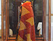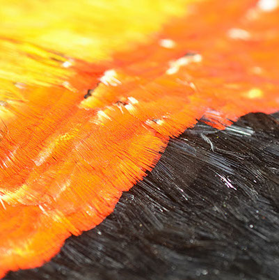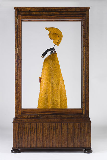 The cloak measures 60 inches in length and 108 inches in width at its base. It contains approximately 200,000 individual Lady Amherst Pheasant feathers