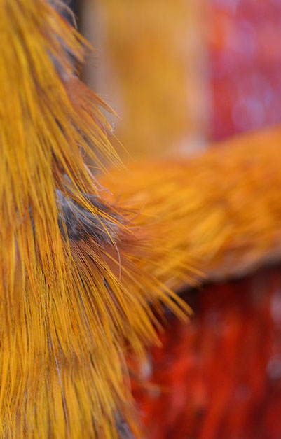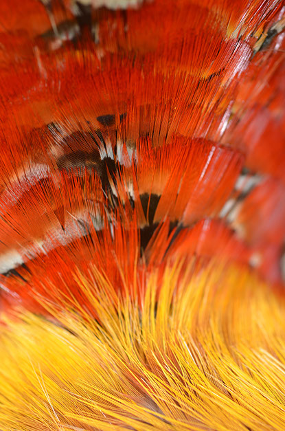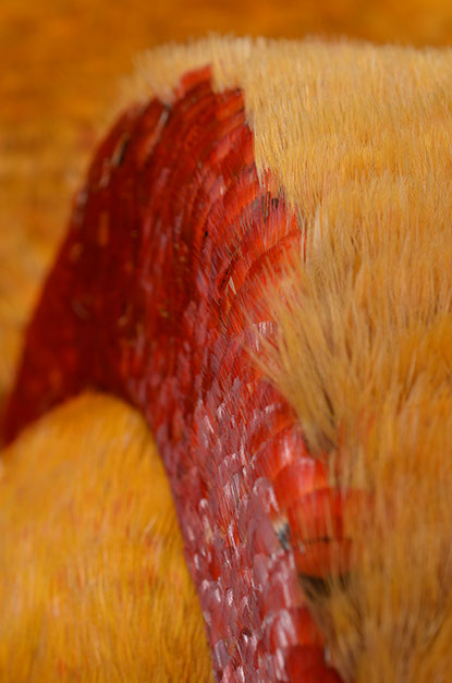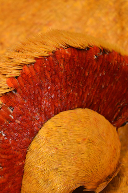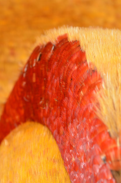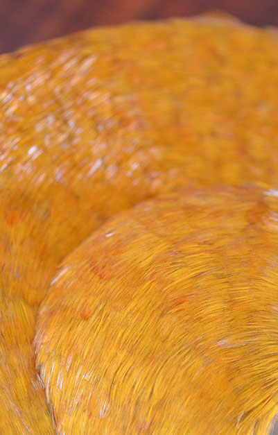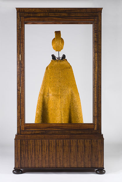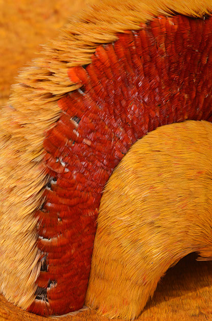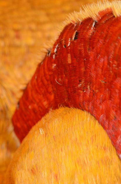 This magnificent cloak is the creation of renowned feather worker Rick San individual Chinese Golden Pheasant feathers (the equivalent of 685 birds) in addition to nearly 50,000 feathers from the Lady Amherst Pheasant (the equivalent of 1,700 birds). All feathers were ethically sourced as a bi-product of pheasants grown for food.